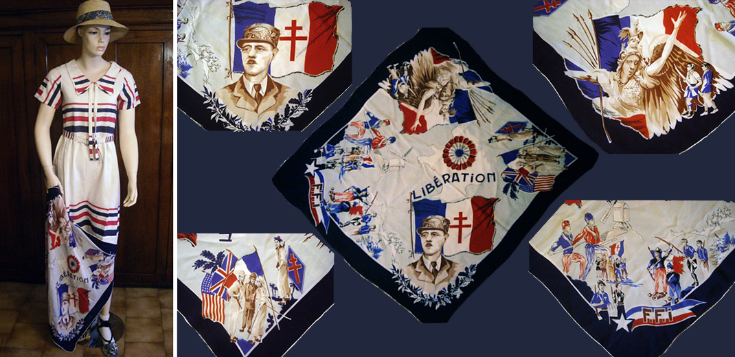 Robe donnée par Mme Mauricette ARONDEL, qui la portait le jour de Libération de Paris, puis une semaine plus tard a acheté le foulard en soie commémoratif décoré de … »
