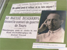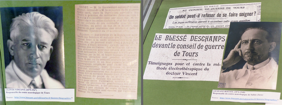 11 AIX-MONTPERRIN _ Le parcours des "mutilés psychiques" de la Grande Guerre 1914-1918 ------------------------------------------ Dans une vitrine de l'exposition : au cours de la conférence, la cas du zouave Baptiste Deschamps a été évoqué : pouvait-il refuser le violent traitement par électrothérapie du Dr Clovis Vincent ? Dans l'armée, le soldat doit obéir aux ordres de son supérieur, en l'ocurrence ici le médecin... Le Dr Clovis Vincent (1879-1947), médecin Aide-Major de 2e classe dans un corps de brancardier divisionnaire en 1914, est nommé médecin-chef du Centre neurologique de la 9e région militaire à Tours en novembre 1915 : pour soigner les soldats frappés "d'obusite" il met au point un traitement faradique vigoureux, communément appélé "torpillage" (plus tard qualifié de torture...). En mai 1916, lors d'une séance de « torpillage », le zouave Deschamps frappe à plusieurs reprises le Dr Vincent et lui fracture le nez : Clovis Vincent réplique et passe à tabac le soldat, épisode qui lui vaudra le surnom de « médecin-boxeur ». Il s'ensuit un procès retentissant : dans son jugement, le tribunal précise que « M. Clovis Vincent a eu tort de torpiller Deschamps par la violence », et condamne le zouave à seulement 6 mois de prison avec sursis.