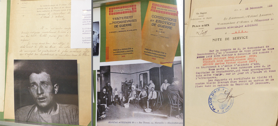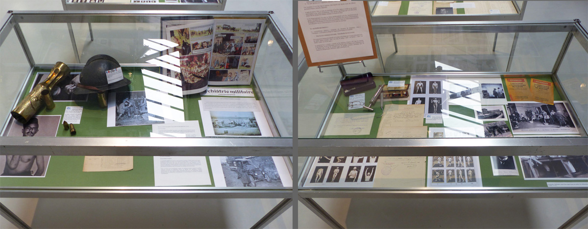 7 AIX-MONTPERRIN _ Le parcours des "mutilés psychiques" de la Grande Guerre 1914-1918 ------------------------------------------ Deux des vitrines de l'exposition, avec de nombreuses photographies d'archive sur le traitement des patients, présentées par le Centre de Documentation Montperrin. Dans la vitrine de gauche, quelques objets rappelant le front, dont un casque "Adrian", modèle 1915, prêté par le Musée de la Mémoire Militaire de Meyreuil.