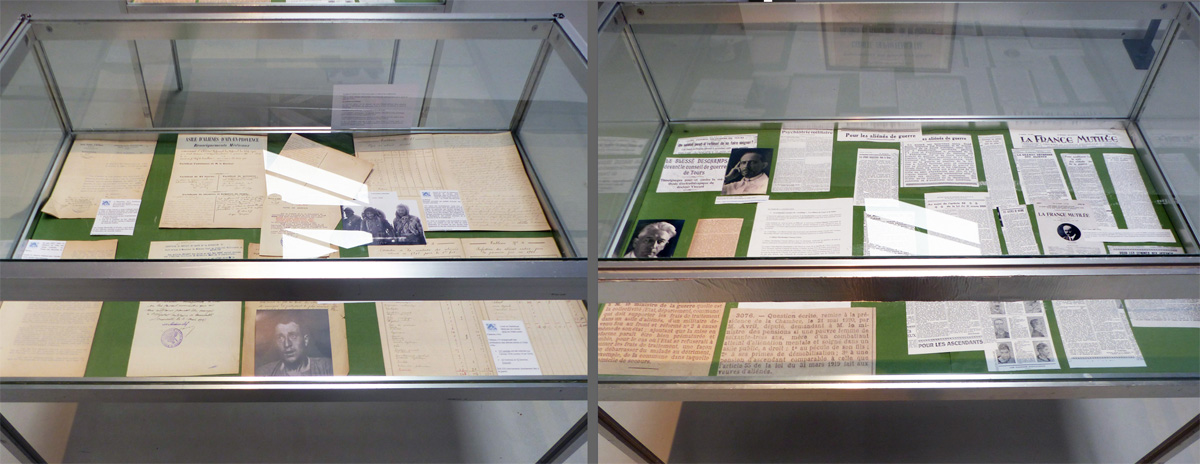 8 AIX-MONTPERRIN _ Le parcours des "mutilés psychiques" de la Grande Guerre 1914-1918 ------------------------------------------ Deux des vitrines de l'exposition, avec de nombreux documents d'archive présentés par le Centre de Documentation Montperrin.