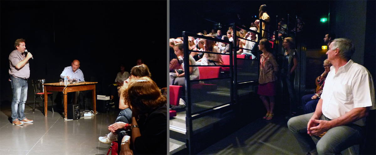 21 AIX-MONTPERRIN _ Le parcours des "mutilés psychiques" de la Grande Guerre 1914-1918 ------------------------------------------ Après la conférence, les gens observent les mannequins, scrutent les vitrines de l'exposition ou s'attardent au stand de la Librairie de Provence qui propose un large choix des livres publiés par les deux conférenciers du soir, le Professeur Louis Crocq et l'historien Jean-Yves le Naour.
