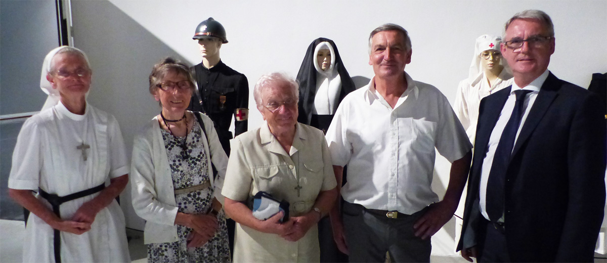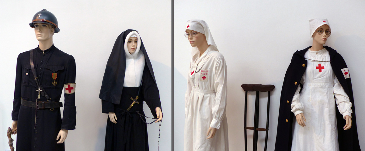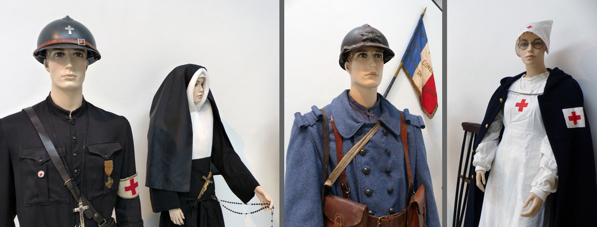 un aumônier militaire catholique ; une soeur de Saint Thomas de Villeneuve d'Aix ; une infirmière A.D.F (Association des Dames de France) ; une nfimière Croix-Rouge de la Grande Guerre.