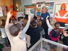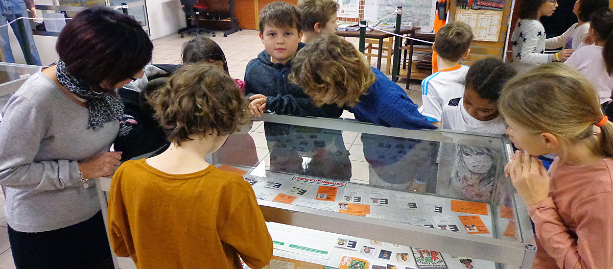24 MEYREUIL _ C.C.F.F. ------------------------------------------ Sandrine ALVAREZ , responsable de la Médiathèque, fait visiter l' exposition aux élèves.