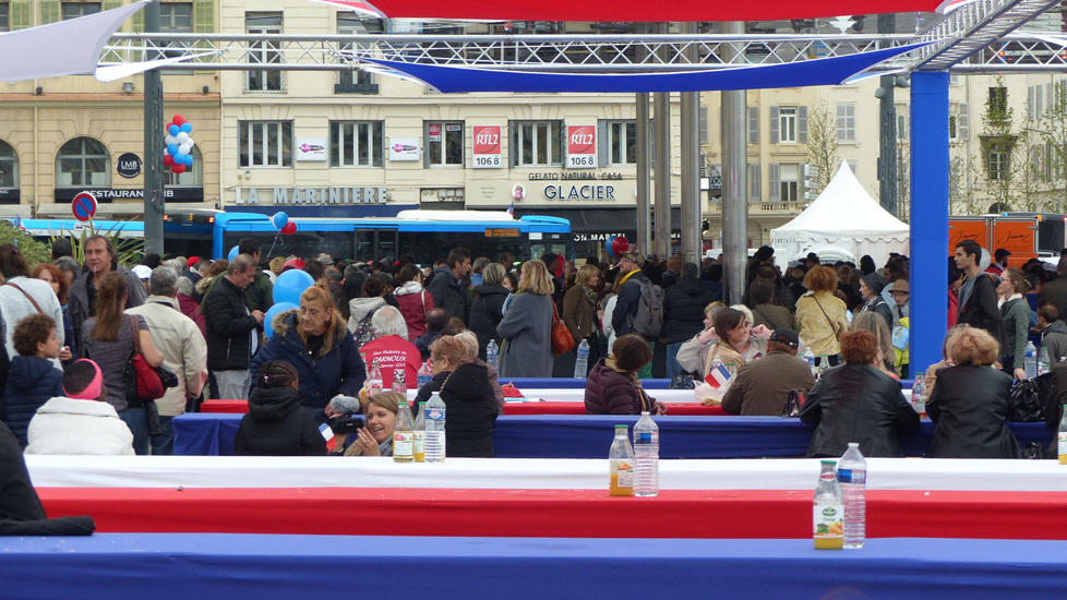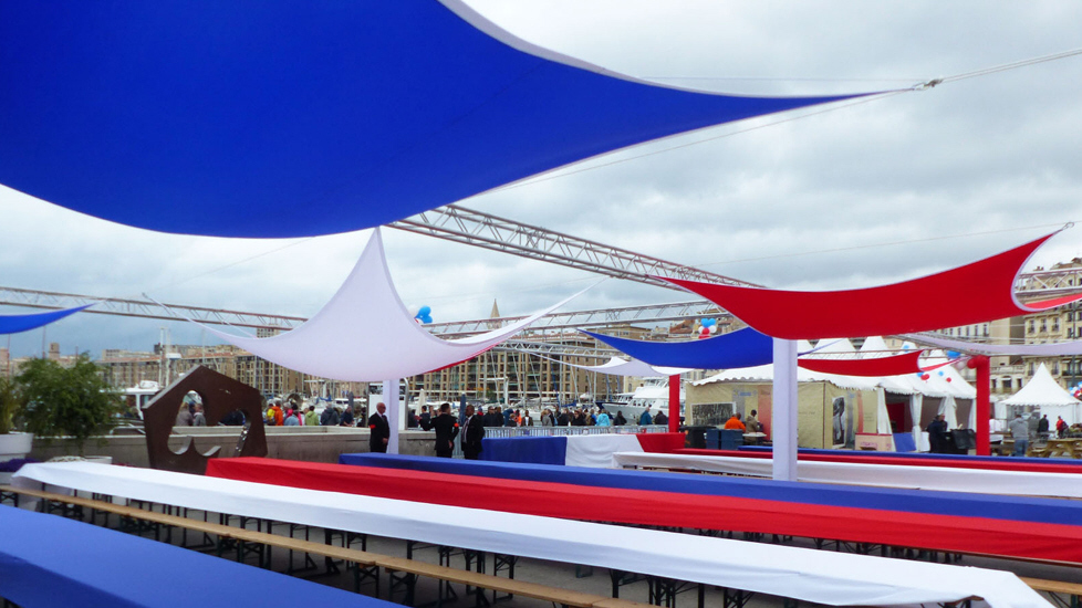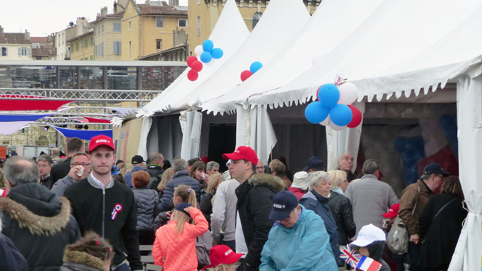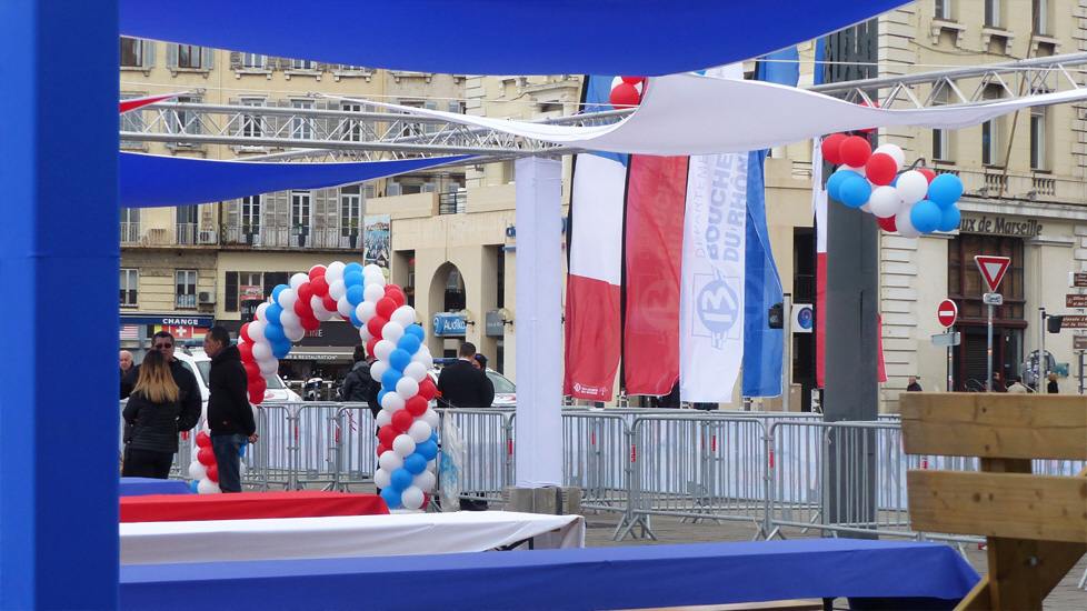 Décorations tricolores, chaises et tables, piste de danse, podium, sonorisation, on s'affaire sous et autour de l'ombrière du Vieux-Port pour que tout soit prêt dès 14H00 quand le public sera admis dans la zone réservée à la commémoration du 8 mai.