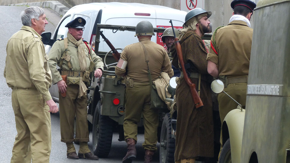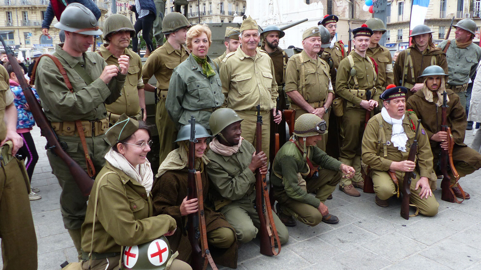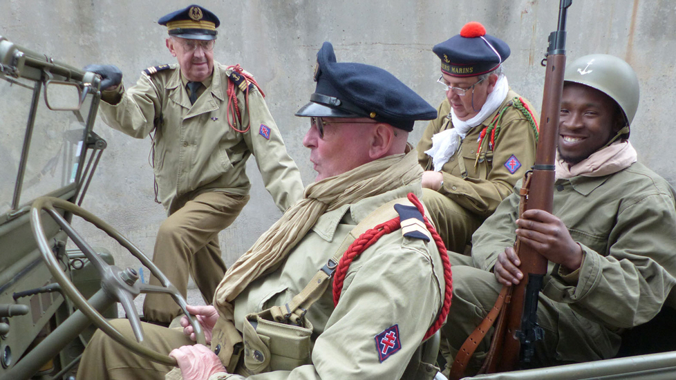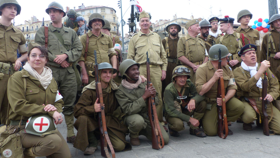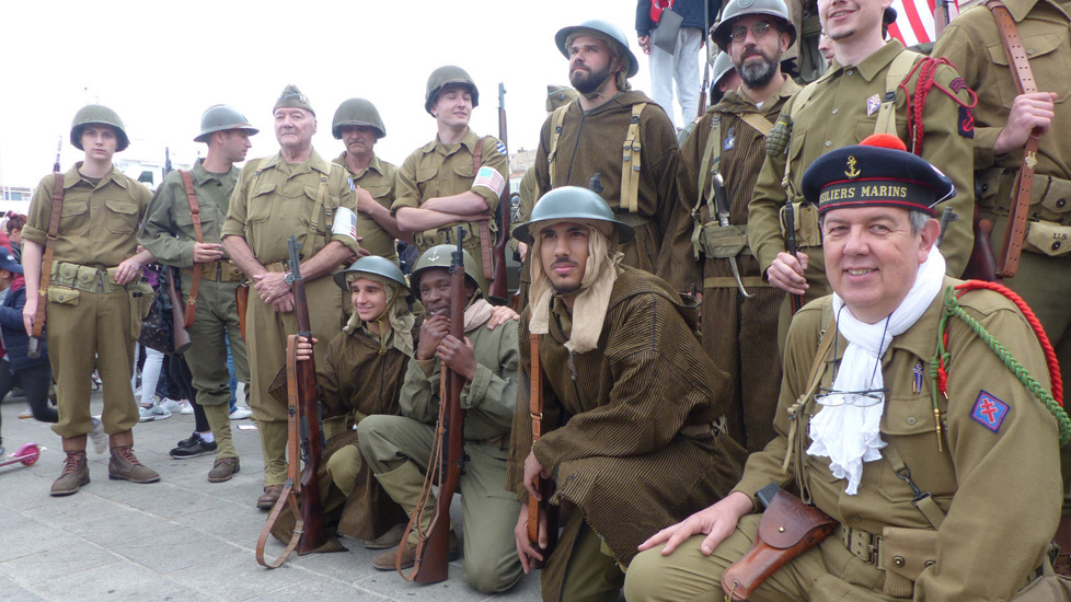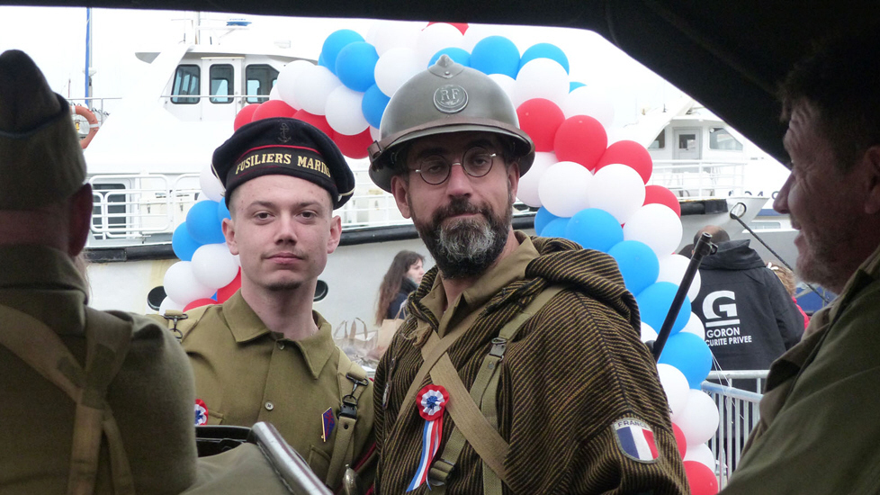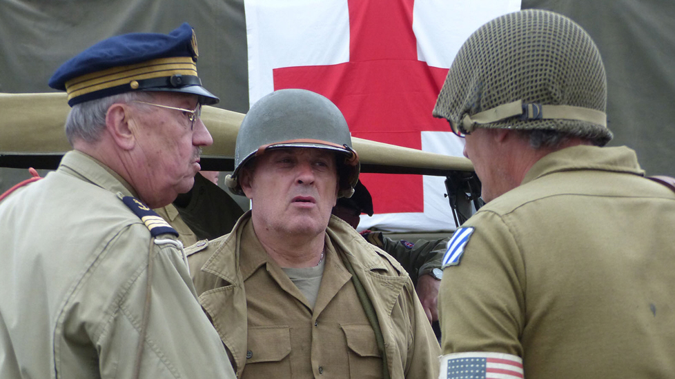 Reconstituteurs en uniformes de 1944 : regroupés en associations, ces sont des bénévoles, passionnés d'histoire, qui répondent volontiers aux questions du public dans les diverses commémorations auxquelles ils participent.
