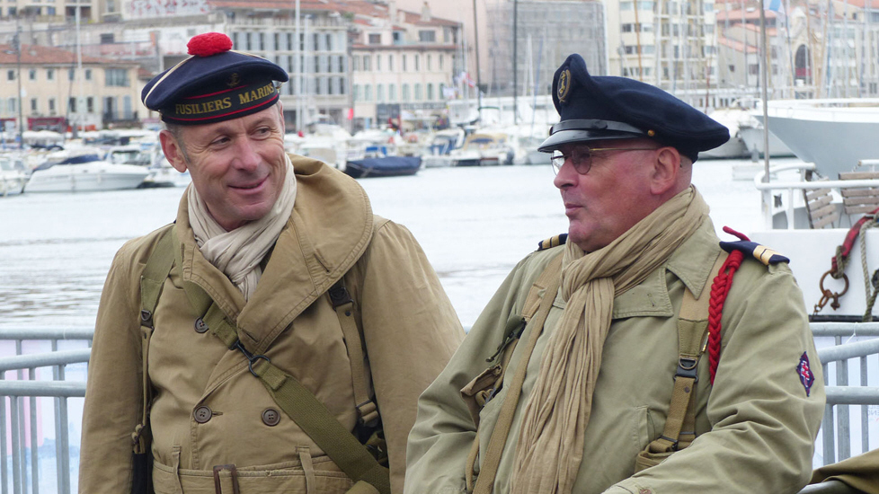 Fusiliers Marins en discussion devant les bateaux du Vieux-Port, reconnaissables à l'ancre de marine sur la casquette et au pompon rouge sur le bachi légendé "Fusiliers Marins".